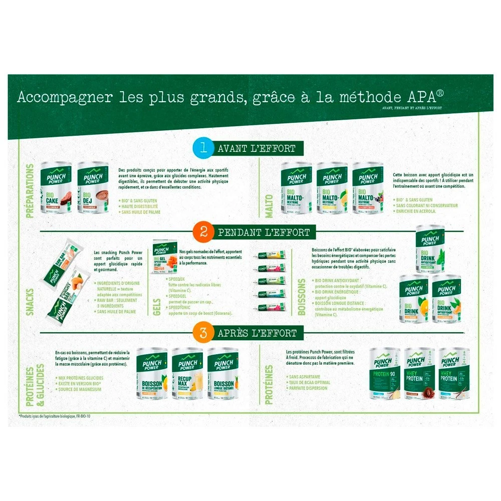 La Biodrink Longue Distance 500 g La boisson énergétique Punch Power Biodrink Antioxydant est le partenaire idéal pour vous accompagner dans vos pratiques sportives intensives. Conçue pour maintenir la performance et améliorer la réhydratation, elle est fabriquée en France à base d’ingrédients bio. Sans gluten, sans colorant ni conservateur, elle contient 45 mg de caféine pour 100 g. Cette boisson est certifiée conforme à la réglementation anti-dopage.